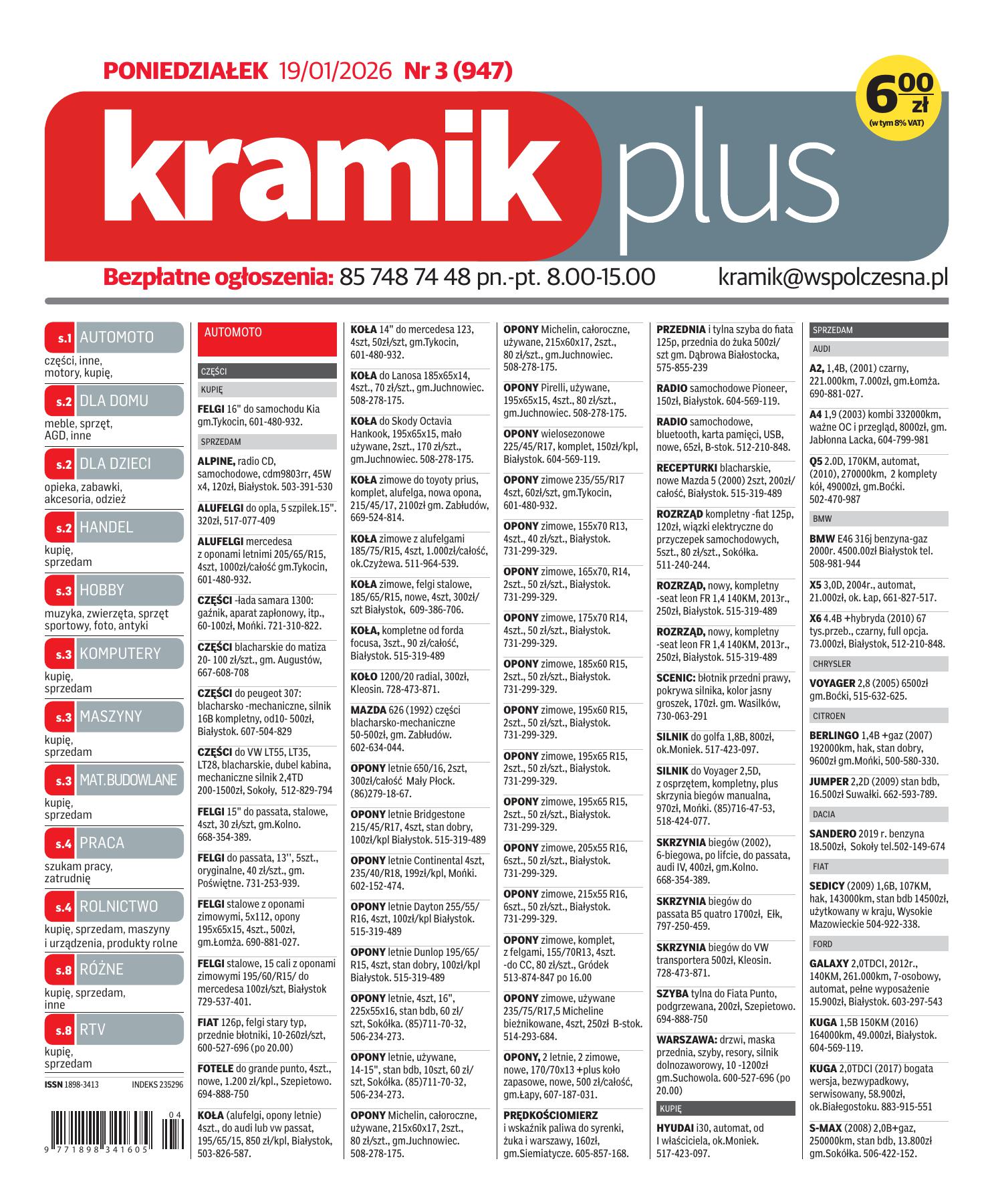 | Kramik Plus to tygodnik ogłoszeniowy ukazujący się w każdy poniedziałek na terenie Podlasia. Kramik Plus to co tydzień oferty firm i osób prywatnych w wielu kategoriach tematycznych. |